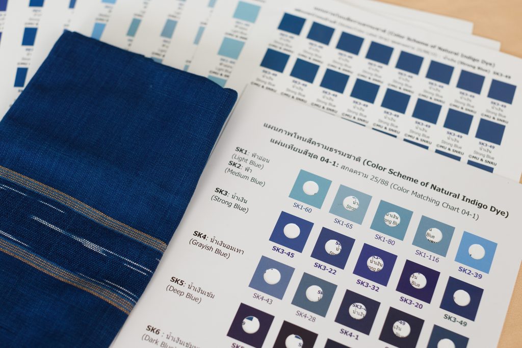 ในโครงการนี้ได้นำแผนภาพโทนสีครามธรรมชาติมาใช้ประโยชน์ในการกำหนดโทนสีและการจัดทำมาตรฐานโทนสีผ้าย้อมครามธรรมชาติ โดยจัดทำเป็นแผ่นเทียบสี (Color Matching Chart) ดังตัวอย่างในภาพที่ 1 และ 2 เพื่อให้กลุ่มผู้ผลิตผ้าย้อมครามธรรมชาติใช้ในการเทียบสีและกำหนดโทนสีของผ้าย้อมครามธรรมชาติแต่ละผืนที่ผลิตได้ และใช้ในการสื่อสารกับผู้จัดจำหน่ายและผู้บริโภค โดยใช้ร่วมกับสติกเกอร์ (ดังตัวอย่างในภาพที่ 3) ซึ่งได้ออกแบบไว้ให้ผู้ผลิตใช้ติดที่ผืนผ้าหรือแถบป้ายกำกับผลิตภัณฑ์ เพื่อระบุข้อมูลสีของผืนผ้าหรือผลิตภัณฑ์ และใช้เป็นเครื่องมือหรือสื่อในการสื่อสารต่อไปยังผู้จัดจำหน่ายตลอดจนถึงผู้บริโภคขั้นสุดท้าย ซึ่งจะช่วยให้การสื่อสารสีครามธรรมชาติมีประสิทธิภาพ มีสื่อกลางที่เป็นมาตรฐานเดียวกันในการทำความเข้าใจได้อย่างชัดเจน ถูกต้องตรงกัน ตลอดสายอย่างครบวงจรตั้งแต่ผู้ผลิตจนถึงผู้บริโภค