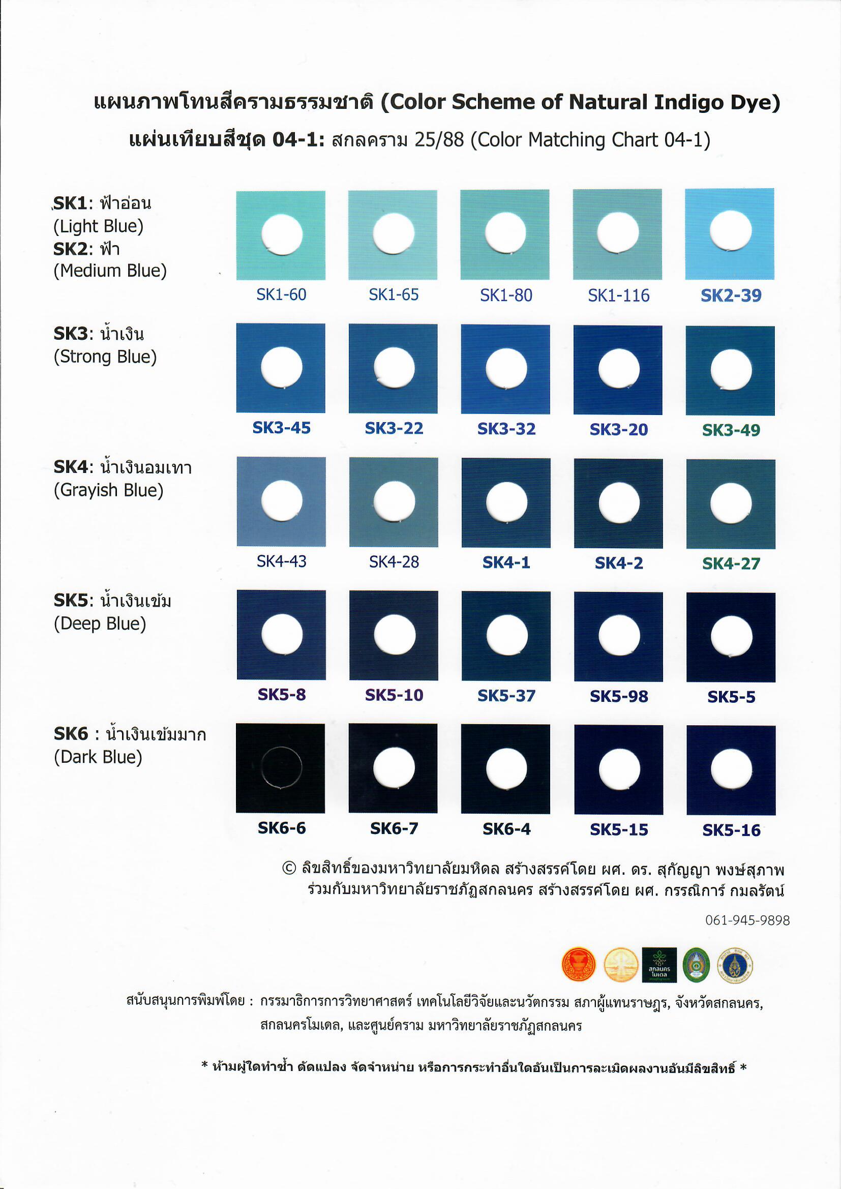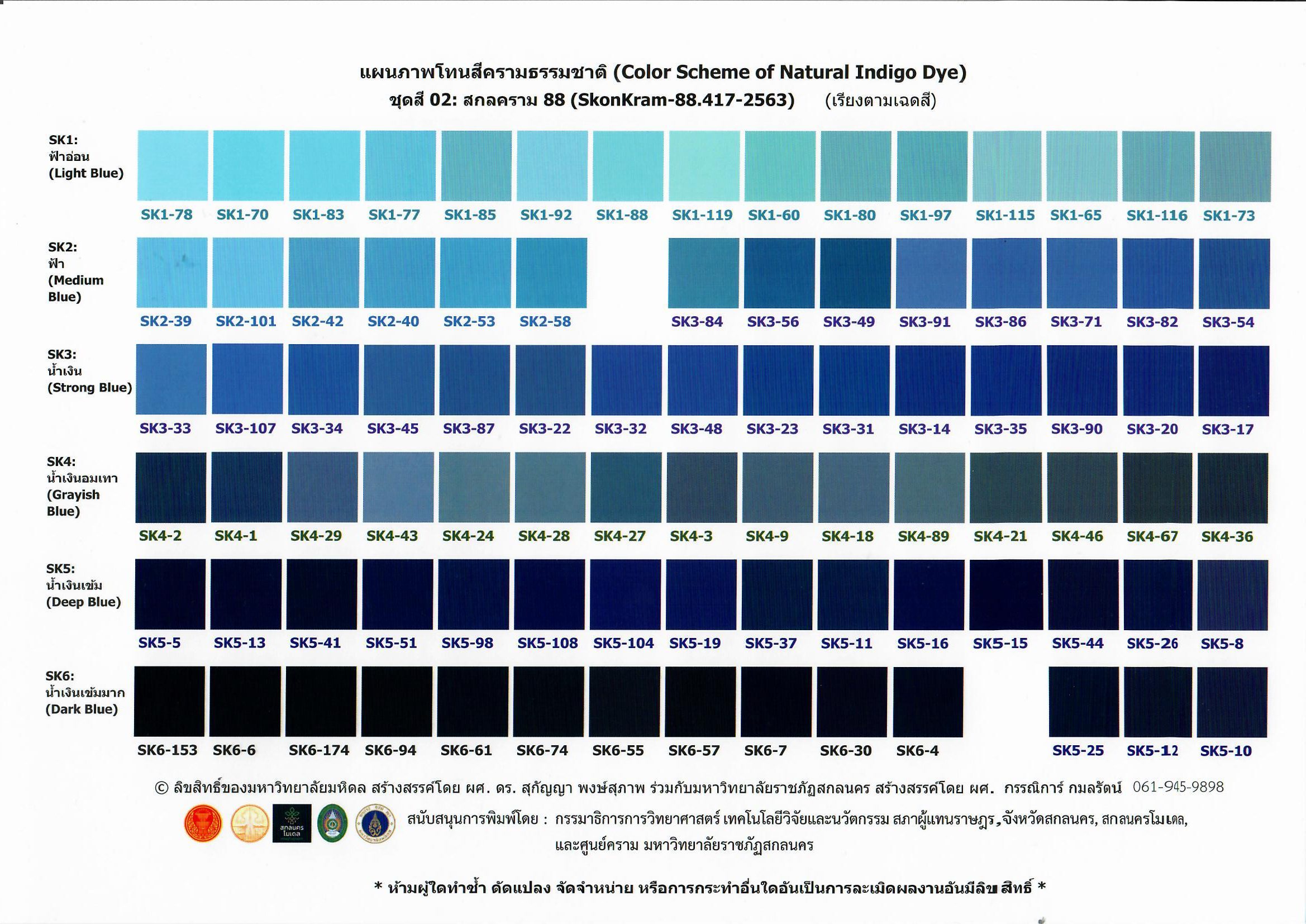 แผนภาพโทนสีครามธรรมชาติ (Color Scheme of Natural Indigo Dye) เป็นผลงานลิขสิทธิ์ของมหาวิทยาลัยมหิดล (สร้างสรรค์โดย ผศ.ดร.สุกัญญา พงษ์สุภาพ) ร่วมกับมหาวิทยาลัยราชภัฏสกลนคร (สร้างสรรค์ โดย ผศ.กรรณิการ์ กมลรัตน์) ผู้สนใจขออนุญาตนำไปใช้ประโยชน์ ติดต่อได้ที่ สถาบันบริหารจัดการเทคโนโลยีและนวัตกรรม มหาวิทยาลัยมหิดล 999 ถ.พุทธมณฑลสาย 4 ต.ศาลายา อ.พุทธมณฑล จ.นครปฐม 73170 โทรศัพท์ 02-849-6056 หรือ ศูนย์คราม มหาวิทยาลัยราชภัฏสกลนคร 680 ถ.นิตโย ต.ธาตุเชิงชุม อ.เมือง จ.สกลนคร 47000 หรือ ผศ.กรรณิการ์ กมลรัตน์ โทร 061-945-9898