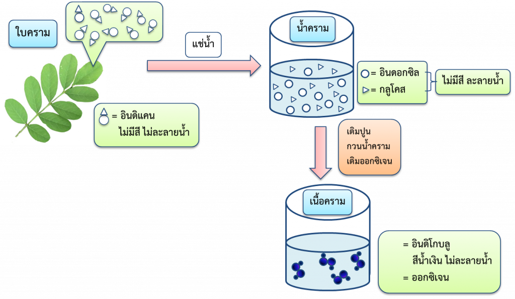 สีครามธรรมชาติถูกสกัดจากใบครามสดในรูปแบบของสารอินดิแคน (indicant หรือ Indoxyl-β-D-glucoside) เป็นสารไม่มีสีและไม่ละลายน้ำแต่เมื่อถูกแช่ในน้ำเอนไซม์ชนิดหนึ่งในใบครามคือ บีตา-กลูโคซิเดส (β-glucosidase) จะช่วยทำให้อินดิแคนแตกออกเป็น 2 ส่วน คือ อินดอกซิล (Indoxyl )และกลูโคส สาร2ตัวนี้เป็นสารไม่มีสี แต่ละลายน้ำได้ทั้งคู่จึงละลายในน้ำครามซึ่งมีพีเอชเท่ากันกับน้ำที่ใช้แช่ใบคราม เติมปูนขาว (CaO) ในน้ำครามกวนแรง ๆ จนเกิดฟอง อินดอกซิลจะถูกออกซิไดส์เปลี่ยนเป็นอินดิโกบลูจับกับอนุภาคปูนขาวตกตะกอนจมอยู่ก้นภาชนะ และจะเก็บเอาส่วนนี้ไว้สำหรับเตรียมสีย้อม (ก่อหม้อ) ในลำดับถัดไป