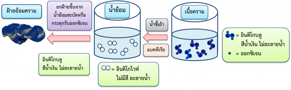 การเตรียมสีครามเป็นการทำให้อินดิโกบลูเปลี่ยนเป็นอินดิโกไวท์ ซึ่งละลายได้ในน้ำด่าง การเปลี่ยนแปลงนี้เป็นปฏิกิริยารีดักชัน ซึ่งใช้ตัวรีดิวส์ได้หลายชนิด อีกวิธีหนึ่งอาศัยการทำงานของแบคทีเรียชนิด บาซิลลัส เช่น Bacillus alkaliphylus ร่วมในกระบวนการหมัก ปฏิกิริยารีดักชันของอินดิโกบลู เกิดขึ้นที่ pH 10.5-11.0 เมื่อเกิดสีครามในน้ำย้อม โดยสังเกตสีของน้ำย้อมเปลี่ยนจากสีน้ำเงินเป็นสีเขียวปนเหลือง จึงทำการย้อมผ้าที่ชุบน้ำแล้วบิดจนหมาด อินดิโกไวท์ที่ละลายในน้ำย้อมจะแทรกซึมเข้าเนื้อฝ้ายจับเซลลูโลสของใยฝ้ายด้วยพันธะไฮโดรเจน เมื่อยกผ้าฝ้ายขึ้นจากน้ำย้อมสัมผัสกับอากาศ อินดิโกไวท์จะถูกออกซิไดส์โดยออกซิเจนในอากาศ กลับเป็นอินดิโกบลูถูงขังอยู่ภายในโครงสร้างของเส้นใยฝ้ายดังเดิม ใยไหมและขนสัตว์มีโครงสร้างทางเคมีเป็นพอลีเพปไทด์ จึงทำให้ย้อมด้วยสีครามได้ไม่ดีเท่าฝ้ายซึ่งมีโครงสร้างทางเคมีเป็นเซลลูโลส อย่างไรก็ตามการย้อมเส้นไหมที่อุณหภูมิต่ำจะดูดซับสีดีกว่าการย้อมที่อุณหภูมิสูง แสดงว่าการย้อมสีครามเป็นกระบวนการคายความร้อน เมื่อย้อมที่อุณหภูมิสูงขึ้นการติดสีจะลดลง
